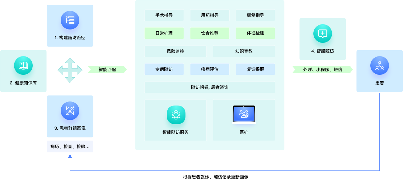 以“互联网+智能化+标准化”的理念为指导,给予集自动疾病分组匹配、智能化随访管理、个性化智能提醒及健康宣教于一体的服务平台。实现疾病分类管理、定期跟踪、按需宣教并及时进行干预,促进患者早日康复。